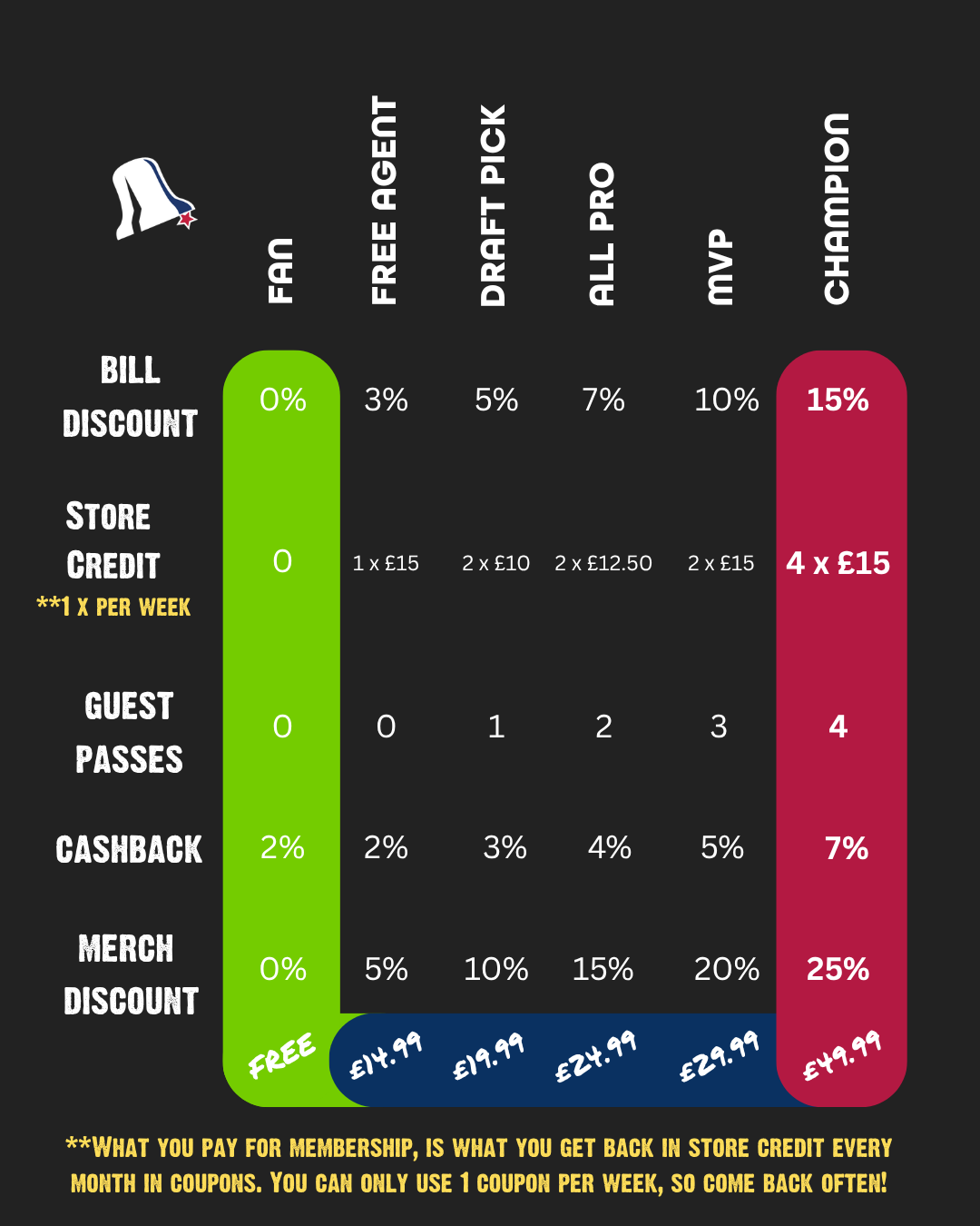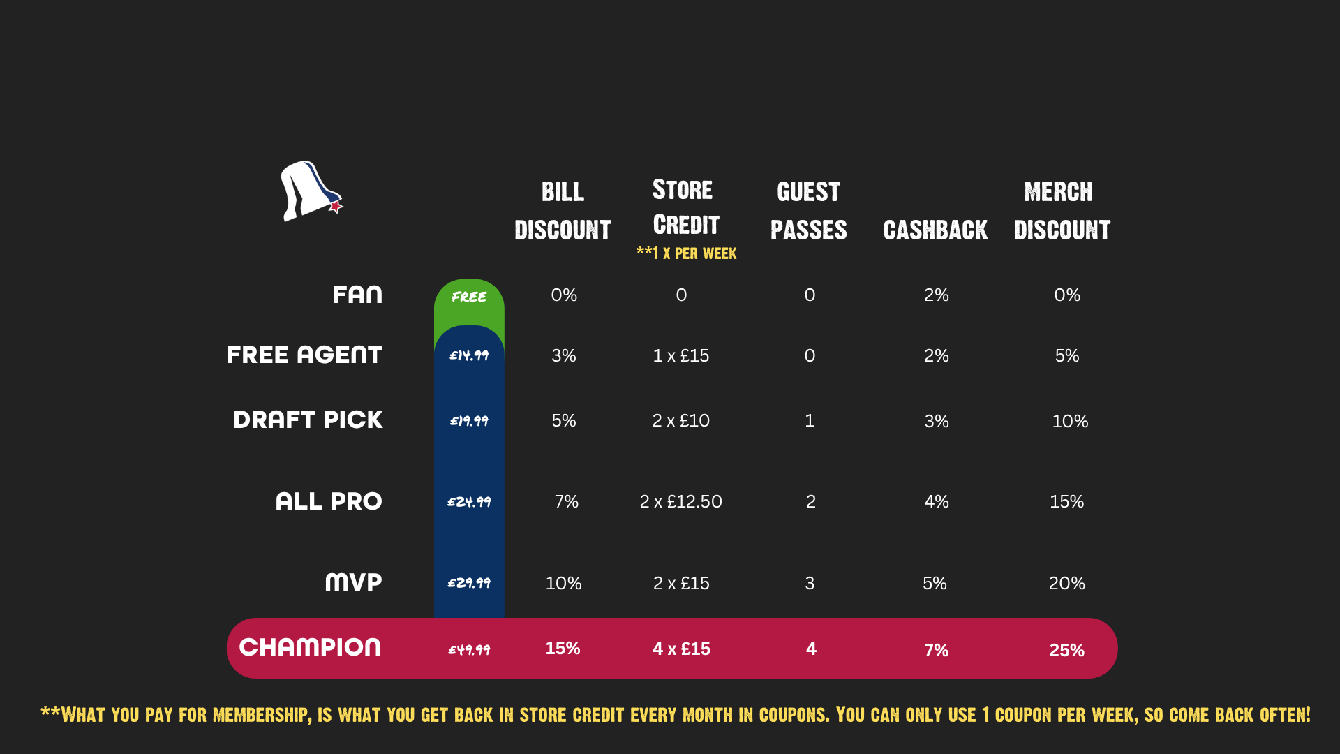 Join the roster and start earning your place on the team. If you’ve reached Gold Fan status, your first month as a Free Agent is on the house — otherwise, it’s just £14.99/month.